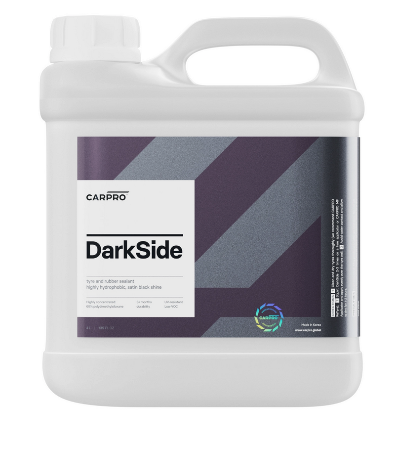 CarPro DarkSide – to silnie skoncentrowany dressing do opon i gumy. Formuła bazująca na 60% polidimetylosiloksanu pozwala na bardzo szybką i łatwą aplikację za pomocą dedykowanych aplikatorów do opon lub mikrofibry, pozostawiając piękny satynowy połysk. Produkt zapewnia dodatkowo świetne właściwości samooczyszczania, hydrofobowe, a także ochronę przed promieniowaniem UV i chemikaliami.
