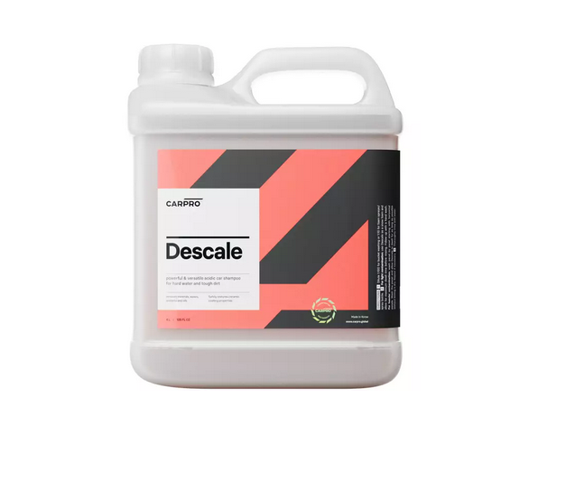 CarPro Descale – to kwaśny szampon samochodowy, który został stworzony z myślą o maksymalnej skuteczności podczas usuwania uporczywych zabrudzeń i śladów po twardej wodzie. Rozbija nagromadzone zanieczyszczenia, które zmniejszają połysk i zapychają powierzchnię zaniedbanych lakierów i powłok.