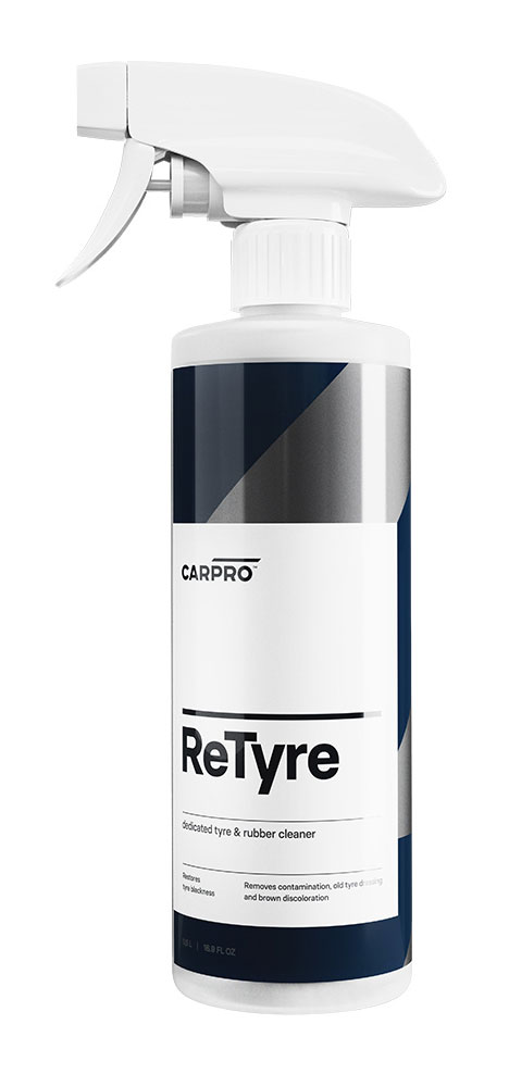 CarPro ReTyre – to produkt przeznaczony do łatwego czyszczenia opon z nagromadzonych dressingów, zanieczyszczeń drogowych i przeciwutleniaczy odpowiedzialnych za brązowienie. Zapewnia lśniący, czysty wygląd opony i przygotowuje ją do aplikacji CQuartz BlackOut, CarPro Perl lub ulubionego dressingu do opon.