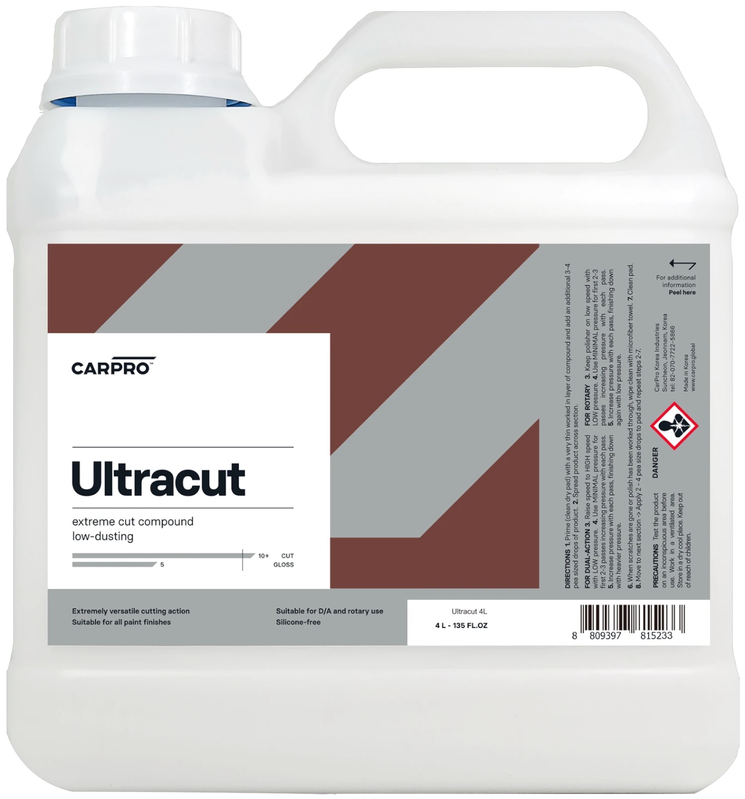 Ultracut zawiera mieszaninę w pełni zmniejszającego się ścierniwa, co pozwala na usuwanie najcięższych defektów lakierów przy minimalnym zamgleniu. W połączeniu z silnie tnącymi padami CarPro, pasta ta efektywnie usuwa najgłębsze zarysowania lakieru. W duecie z CarPro Orange Polishing Pad zapewnia wykończenie bez hologramów, nawet na najbardziej wymagających lakierach.