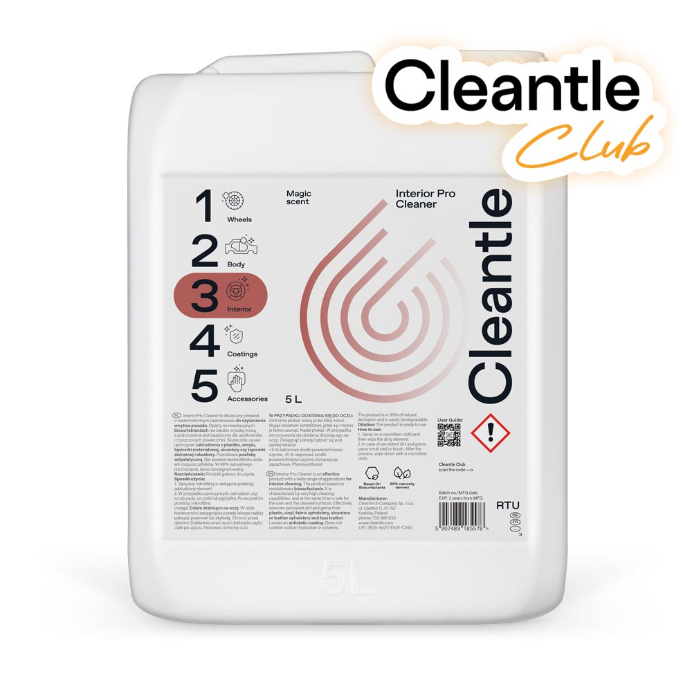 Interior Pro Cleaner to skuteczny i bezpieczny preparat o wszechstronnym zastosowaniu do czyszczenia wnętrza pojazdu. Produkt oparty na rewolucyjnych biosurfaktantach cechuje się bardzo wysoką mocą, a jednocześnie jest bezpieczny dla użytkownika i czyszczonych powierzchni. Skutecznie usuwa uporczywe zabrudzenia z plastiku, winylu, tapicerki materiałowej, alcantary czy tapicerki skórzanej i ekoskóry. Pozostawia powłokę antystatyczną, dzięki której mniej kurzu osiada we wnętrzu auta. Nie zawiera wodorotlenku sodu ani rozpuszczalników. Produkt w 98% naturalnego pochodzenia oraz łatwo biodegradowalny.