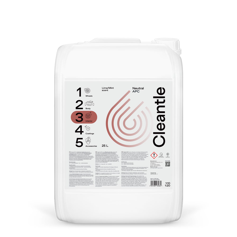 Neutral APC to wszechstronny i bezpieczny środek czyszczący, przeznaczony do stosowania zarówno wewnątrz, jak i na zewnątrz pojazdu. Zastosowanie biosurfaktantów sprawia, że produkt łączy wysoką skuteczność z bezpieczeństwem zarówno dla użytkownika, jak i czyszczonych powierzchni. Dzięki neutralnemu pH, doskonale sprawdza się na plastikach, gumowych elementach, tapicerce materiałowej, lakierze i innych delikatnych materiałach.