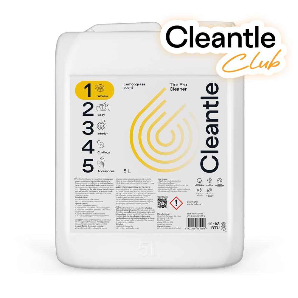 Cleantle Tire Pro Cleaner to produkt do skutecznego czyszczenia opon i elementów gumowych. Zaawansowana formuła oparta na biosurfaktantach głęboko penetruje i czyści opony, usuwając zabrudzenia oraz pozostałości po dressingach do opon. Bezpieczny dla felg, układu hamulcowego oraz elementów gumowych, w tym uszczelek. Nie zawiera wodorotlenku sodu. Produkt łatwo biodegradowalny.