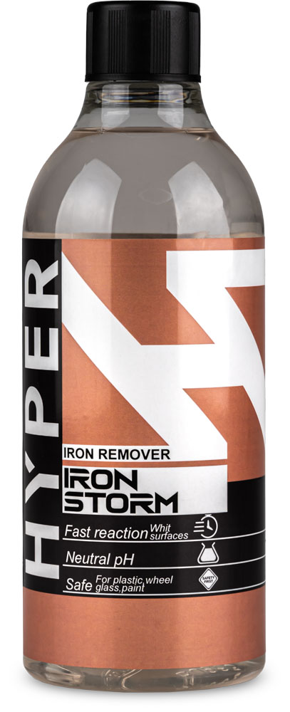 Hyper Iron Storm Iron Remover to produkt typu iron remover, gotowy do użycia. Neutralne pH skutecznie usuwa zanieczyszczenia pochodzenia metalicznego z lakieru, szkła, plastików oraz felg. Zaawansowana formuła natychmiast reaguje z osadami metalicznymi, rozpuszczając je na charakterystyczny kolor fioletowy. Dodatkowo, zawarte w składzie środki powierzchniowo-czynne ułatwiają spłukanie produktu za pomocą myjki ciśnieniowej. Co ważne, Hyper Iron Storm nie posiada przykrego zapachu „zgniłego jajka”, który często towarzyszy tego typu produktom.