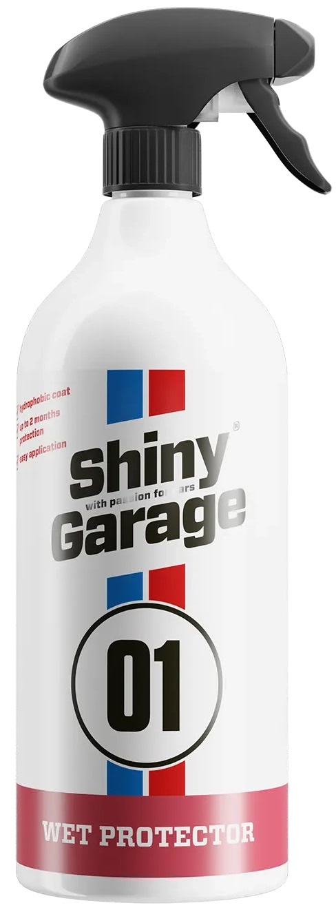 Shiny Garage Wet Protector – to produkt do zabezpieczenia lakieru na mokro. To jeden z najszybszych sposobów na poprawienie właściwości hydrofobowych i zabezpieczenie lakieru, dzięki połączeniu nanocząsteczek, polimerów i SiO2. Produkt aktywuje się pod wpływem wody i buduje trwałe wiązania z powierzchnią, tworząc trwałą hydrofobową powłokę. Może być stosowany jako podbicie właściwości hydrofobowych wosków/sealantów czy powłok kwarcowych i ceramicznych, lub jako LSP. Najlepiej działa na tafli wody.