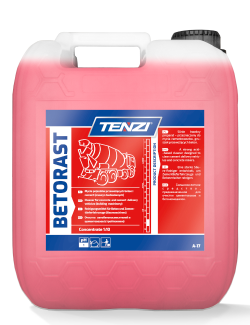 Tenzi Betorast to silny środek do usuwania śladów po cemencie. Idealny do czyszczenia pojazdów i urządzeń specjalistycznych z zanieczyszczeń cementowych. Preparat jest skoncentrowany i silnie kwaśny, co czyni go skutecznym w usuwaniu rdzy, kamienia wodnego oraz nacieków pochodzenia cementowego z powierzchni odpornych na kwasy. Zawiera inhibitory korozji, co zwiększa jego efektywność i chroni czyszczone powierzchnie.