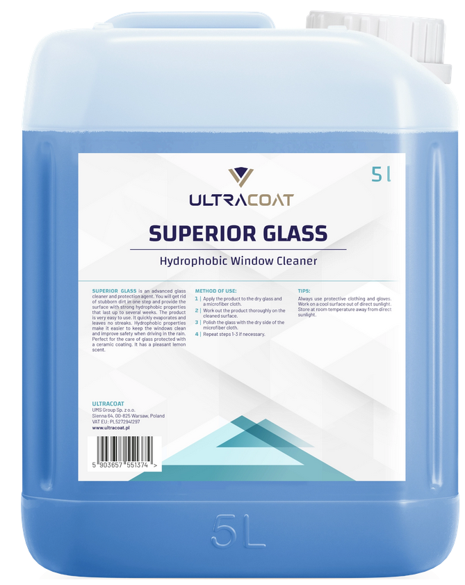 Ultracoat Superior Glass to nowoczesny płyn do czyszczenia i ochrony szyb. Jednocześnie usuwa uporczywe zanieczyszczenia i zapewnia powierzchni silne właściwości hydrofobowe, które utrzymują się nawet przez kilka tygodni. Produkt jest niezwykle łatwy w użyciu. Błyskawicznie odparowuje i nie pozostawia smug. Właściwości hydrofobowe ułatwiają utrzymanie szyb w czystości oraz zwiększają bezpieczeństwo podczas jazdy w deszczu.